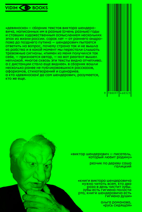 «Девяноска» — сборник текстов Виктора Шендеровича, написанных им в разные (очень разные) годы и ставших художественным осмыслением нескольких эпох из жизни России. Сорок лет — от раннего Андропова до позднего путина — Шендерович пытается ответить на вопрос, почему страна так и не вышла из рабства и в какой момент мы перестали слышать тревожные сигналы. «Пимен из меня получился так себе, — признается автор, — но вот реагент вышел неплохой. Многое сквозь эти тексты видно отчетливо, а с дистанции стало еще виднее». В сборник вошли несколько ранее не публиковавшихся рассказов, афоризмов, стихотворений и сценариев. А кто «девяноска»? Да сам Шендерович, разумеется, кто же еще.
