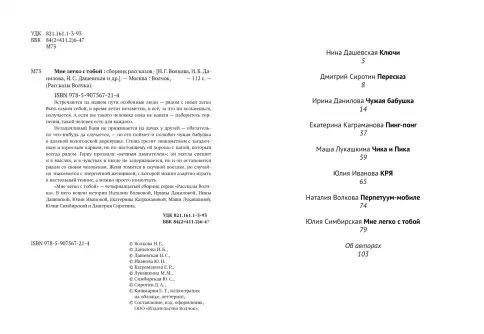 "Мне легко с тобой" - четырнадцатый сборник серии "Рассказы Волчка". В него вошли истории Наталии Волковой, Ирины Даниловой, Нины Дашевской, Юлии Ивановой, Екатерины Каграмановой, Маши Лукашкиной, Юлии Симбирской и Дмитрия Сиротина.