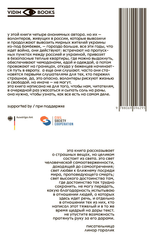У этой книги четыре анонимных автора. Но их — волонтеров, живущих в России, которые вывозили и продолжают вывозить мирных жителей Украины из-под бомбежек, — гораздо больше. Все эти годы, что идет война, они действуют: встречают на пропускных пунктах между Россией и Украиной, привозят в безопасные теплые квартиры, где можно выдохнуть, обеспечивают чемоданами, едой и одеждой, а потом провожают на границах, откуда у беженцев начинается путь в Европу. А еще они слушают. Часто они становятся первыми слушателями для тех, кто пережил страшное. Да, это опасно. Волонтеры рискуют жизнью и свободой. Но иначе — не могут. Эта книга написана не для того, чтобы нам, читателям, в очередной раз ужасаться и сыпать соль на раны. Она нужна, чтобы узнать, как все есть на самом деле.