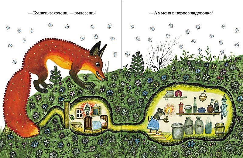 Прочитав маленькую сказку В.В. Бианки «Лис и мышонок», Васнецов изобразил целый спектакль, участником которого становится читатель. <…> Вот Лис с палкой стоит около норки и думает, как ему поймать мышонка? Как попасть в норку? Вы смотрите на Лиса и вдруг ощущаете, что на вас с рисунка смотрит большой холодный месяц. Он светит на Лиса и на вас колючими лучами. А потом вы замечаете: Мышонок сладко спит в своей маленькой кроватке. Спит, а в окошко глядит месяц, но только маленький, спокойный. И он не мешает Мышонку спать.