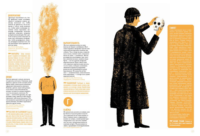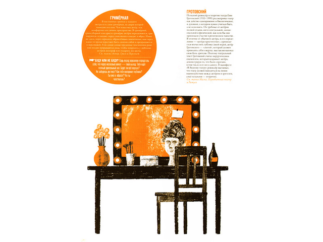БЕЗБИЛЕТНИК, ПЕРФОРМАНС, СЦЕНА, АНШЛАГ, ЛОЖА БЕНУАРА, МЕЙЕРХОЛЬД, КУЛИСЫ, РЕКВИЗИТ, ДИОНИС. И еще более 200 слов о театре, драматургах, актёрах и режиссёрах собраны в этой книге. Это словарь — потому что театральные термины, которыми пользуются люди во всем мире, собраны тут от А до Я. Эти слова пришли из Древней Греции, из Франции эпохи Просвещения, оттуда, где зародилась и развивалась драматургия, режиссура и актерское мастерство. Наш черед наступил в ХХ веке, когда Русские сезоны Дягилева своими новшествами обогатили не только театр, но и мировое искусство в целом, Станиславский и Мейерхольда разработали системы подготовки актеров к роли, а Чехов написал пьесы, которые вот уже более ста лет идут на сценах всех континентов. А ещё это тетрадь с заданиями. Почти в каждой статье можно найти подсказки, советы или упражнения для развития актерских навыков, а на специальных разворотах — мастер-классы по изготовлению маски, декорации, кукол, грим.