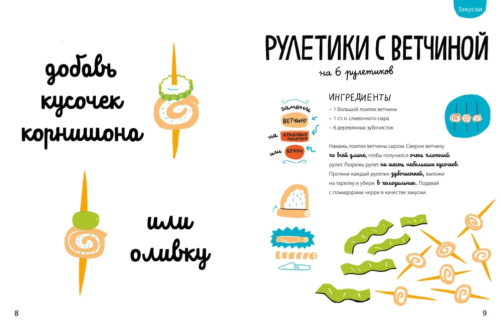 Кулинарная детская книга с доступными, изысканными, вкусными... и яркими рецептами! Слойки с сыром, рыбный хлеб, рататуй, киш с ветчиной, клубничный торт без выпечки, шоколадный фондан — книга состоит из трех частей — закуски, горячее и десерты. Забавные иллюстрации превращают рецепты в настоящий праздник: кто сказал, что с едой нельзя экспериментировать?