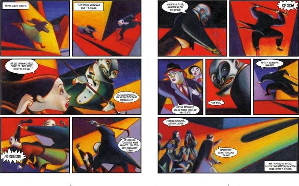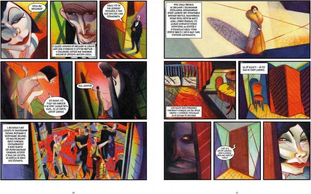 Авторы комикс-адаптации, художник Лоренцо Маттотти и сценарист Джерри Крамски, в полной мере воздали дань уважения первоисточнику. С помощью насыщенных красок, обманчивых теней и абстрактных фигур, превращающихся на глазах то в людей, то в зверей, они создали тревожную, пугающую атмосферу, которая отражает самую суть повести Стивенсона — двойственность человеческой природы.