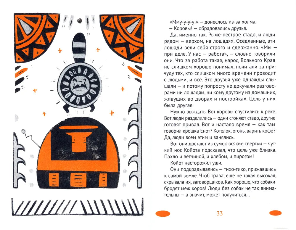 Однажды летом молодой Койот решает покинуть свою стаю и начать взрослую жизнь. Как построить дом? Как добывать пропитание? Хорошо, что ему повстречался Енот – вдвоем-то куда веселее! Поселились друзья в большой норе и стали промышлять: то у пастухов припасы стащат, то в курятник проберутся через хоречий лаз. Вспоминают хитрости родичей и за людьми наблюдают, опыту набираются. Всё-то друзьям интересно: как орлы рыбу ловят, как люди сеть плетут и что там, в дальних краях, где Небесный народ живет. И впереди у них приключений – не счесть!