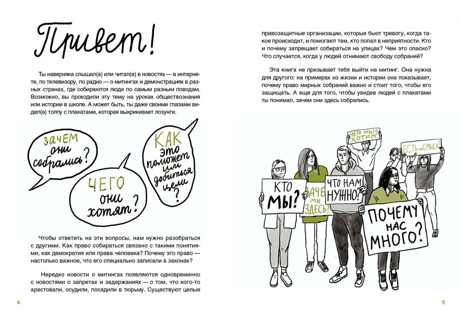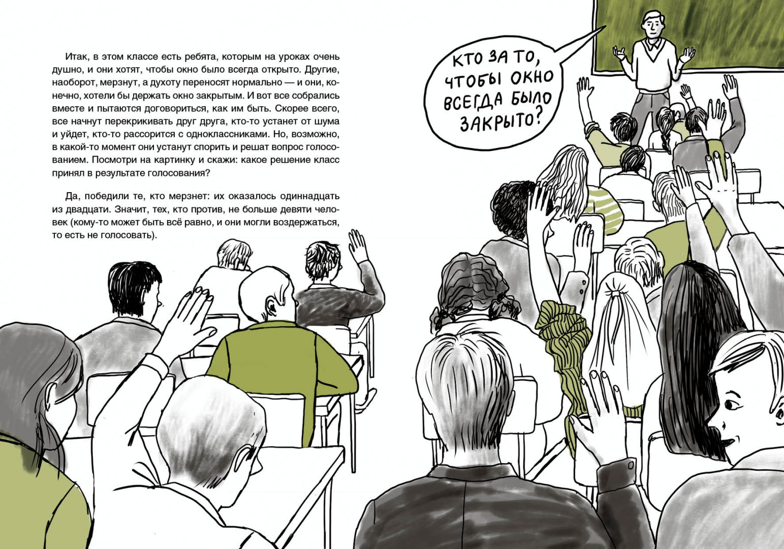 Книга «Вы зачем здесь собрались?» — путеводитель по истории мирных собраний. Она рассказывает о том, как люди, начиная с древнейших времен, принимали самые разные решения сообща. Вместе с учениками Воображаемого 9 «Д» (Д – Демократия) ты узнаешь, зачем голосовали афиняне, как ирландцы придумали бойкот, что такое итальянская забастовка и многое другое. А ещё в книге есть задачи, которые помогут тебе понять, почему собрания важны для каждого, и научиться мирно выражать своё мнение вместе с другими.