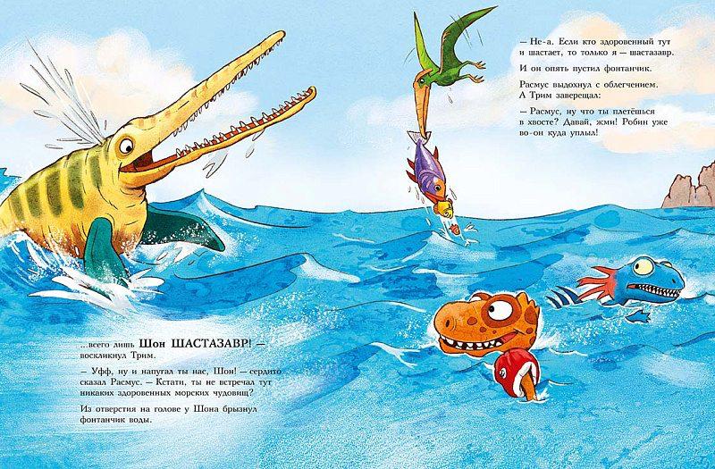Каждая книга серии «Друзья-динозаврики» рассказывает об одном дне из жизни тираннозаврика Расмуса Рекса и его лучшего друга Трима Троодона. Во второй книге действие происходит на пляже Маленького озера, куда по случаю солнечной погоды пришла позагорать вся семья Рексов. Трим зовет Расмуса купаться, но тому больше нравится лежать на теплом песочке. Тут появляется старший братец Расмуса Робин и, как обычно, начинает задираться и дразниться. А потом предлагает Расмусу и Триму устроить заплыв до острова и обратно. Вся эта затея не сулит Расмусу ничего хорошего: сказать по правде, плавает он неважно, да еще эти слухи о морском чудовище, которое якобы видели в озере. Скрепя сердце он принимает вызов, только чтобы доказать противному братцу, что никакой он не трус. Никто не сомневается, что победит Робин — он всегда выигрывает. Однако совершенно неожиданно у Расмуса находится защитник, и Робин получает хороший урок.