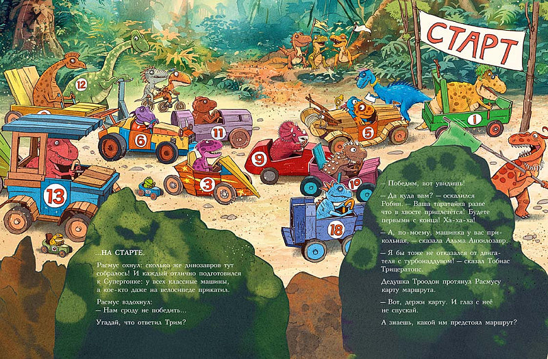 Каждая книга серии «Друзья-динозаврики» рассказывает об одном дне из жизни тираннозаврика Расмуса Рекса и его лучшего друга Трима Троодона. В тот день в Динозаврии стартовала Супергонка Болотного леса. Её устраивали в Динозаврии каждый год, но раньше Расмус и Трим в ней не участвовали — не на чем было. А в этом году у них появился автомобиль. Трим случайно наткнулся на него в тайной комнате механизмов и изобретений своего дедушки и уговорил деда подготовить автомобиль к Супергонке. Дедушка Троодон напридумывал кучу полезных приспособлений, и старая машина преобразилась — она стала быстрой, маневренной и безопасной. Впервые в жизни водителю Триму и штурману Расмусу предстояло пройти сложнейшую трассу. Несмотря на это, Трим был уверен, что они победят. Расмус, напротив, сильно сомневался, что они смогут преодолеть все препятствия и выиграть у Фредди Фукуираптора — супергонщика, который последние пять лет выходил победителем. Гонку друзья не выиграли, зато вывели обманщика и горе-чемпиона Фредди Фукуираптора на чистую воду.
