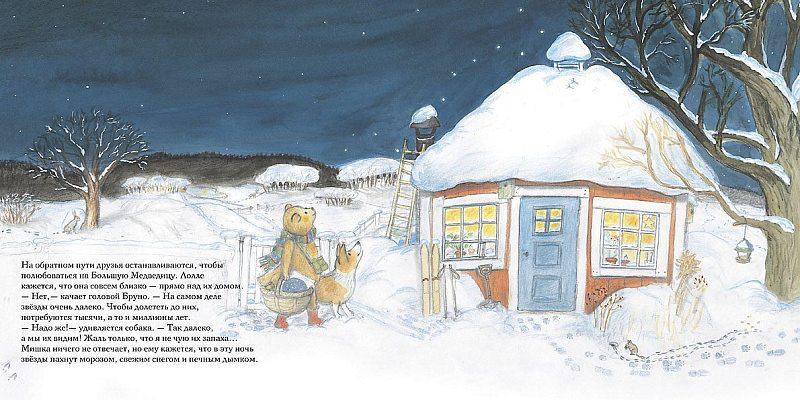 В книге «Зима мишки Бруно» мишка с собакой подкармливают семенами оставшихся на зимовье птиц, учатся различать на снегу следы животных – мыши-полевки, зайца, косули, а еще собачьи и птичьи следы. Бруно с Лоллой попадают в снежную метель, замерзают, отогреваются дома у печки, пекут оладья на обед. А вечером, когда стемнело, небо прояснилось и на нем особенно отчетливо стали видны звезды и луна, Бруно с Лоллой взяли бинокль, карту звездного неба и пошли любоваться созвездиями и луной.