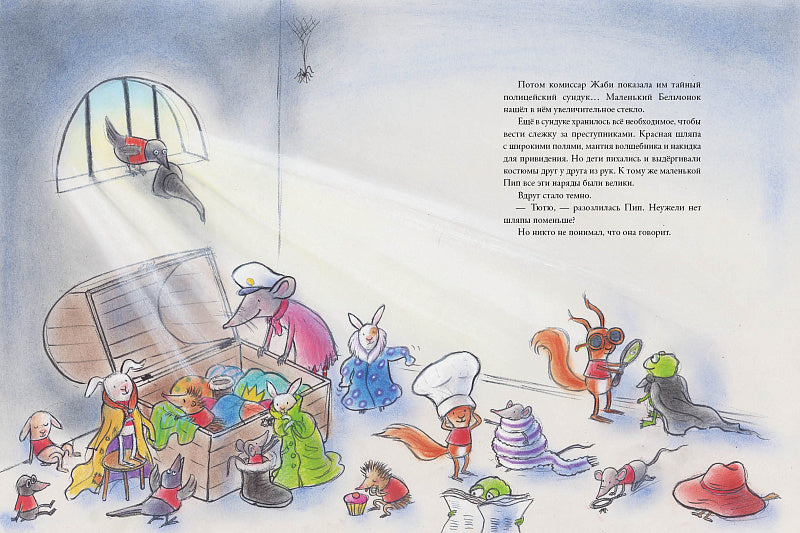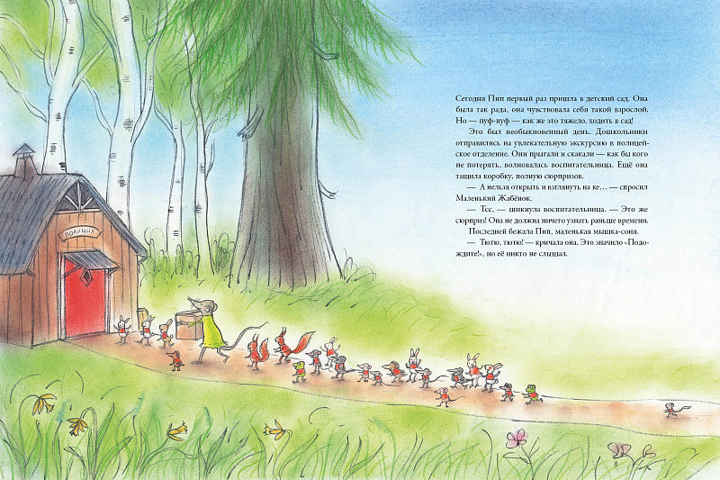 Пип — самая маленькая и очень смышлёная мышка-соня. Сегодня у неё необычный день: она первый раз пришла в детский сад и сразу же отправилась на экскурсию в полицейский участок. И ужасно разозлилась, ведь из-за её роста ей не видно, как работает полиция! Но иногда не так уж и плохо быть самым маленьким.