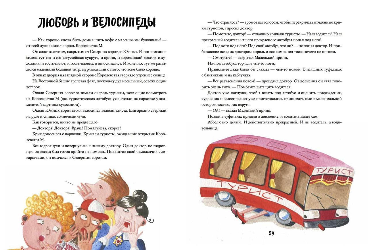 Поэтому, восседая на бесстрашном тигрекоте, вместе с друзьями он отважно пускается на помощь утопающим, спасает народ соседнего королевства от серости и поднимается высоко в горы ради любви своего приятеля художника. А король с королевой с нетерпением ожидают возвращения смельчаков, чтобы за чашкой чая с маленькими булочками снова и снова расспрашивать путешественников о подробностях дальних странствий. С событиями первой части книги "Королевство М" некоторые читатели уже знакомы, а вот вторая и третья издаются впервые.