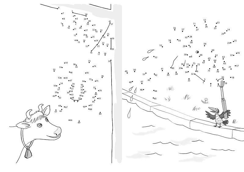 Мама Му и Кракс катаются на велосипеде, лазают по деревьям и ловят рыбу. Кто же там плавает в воде? И о чём мечтает Кракс? Соедини точки, и увидишь спрятанный рисунок.