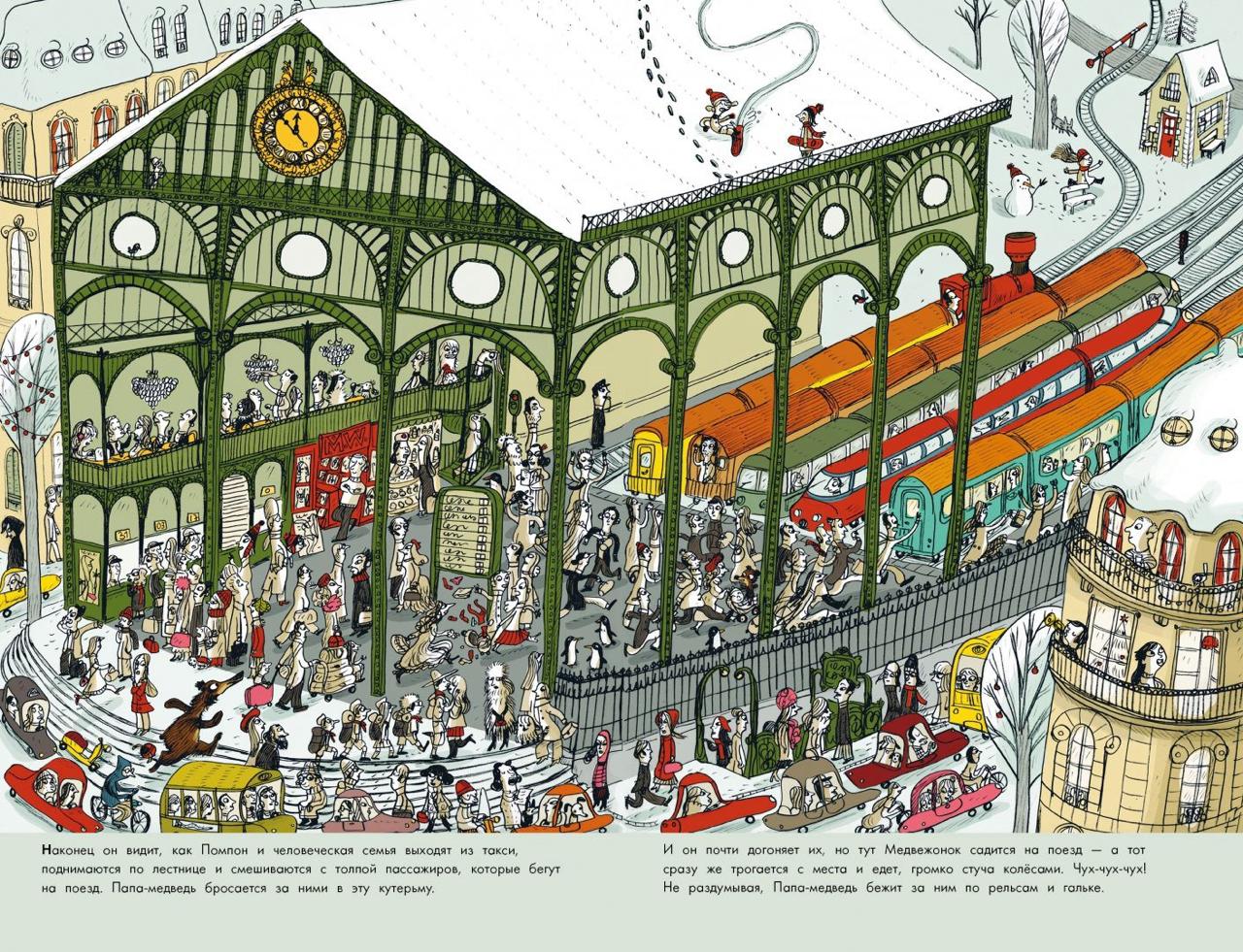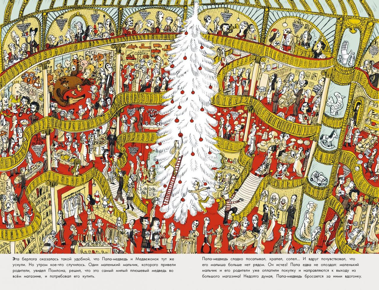 Папа и медвежонок Помпон долго искали, куда бы спрятаться от снегопада, - и нашли прекрасную просторную берлогу, где уже ютились сотни разноцветных медведей. А утром сын пропал: берлога оказалась магазином, и Помпона купил и унёс с собой какой-то мальчик! Не раздумывая ни минуты, папа-медведь бросается в погоню! Как же ему догнать медвежонка?!