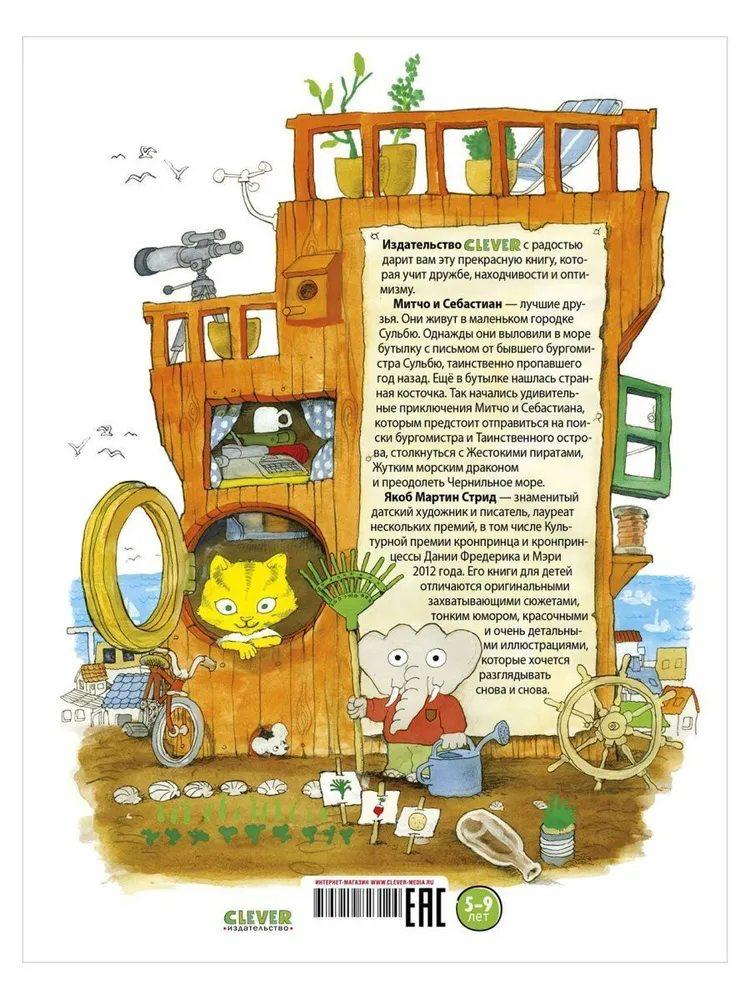 Митчо и Себастиан - лучшие друзья. Они живут в маленьком городке Сульбю. Однажды они выловили в море бутылку с письмом от бывшего бургомистра Сульбю, таинственно пропавшего год назад. Еще в бутылке нашлась странная косточка. Так начались удивительные приключения Митчо и Себастиана, которым предстоит отправиться на поиски бургомистра и Таинственного острова, столкнуться с Жестокими пиратами, Жутким морским драконом и преодолеть Чернильное море. Мартин Якоб Стрид - знаменитый датский художник и писатель, лауреат нескольких премий, в том числе Культурной премии кронпринца и кронпринцессы Дании Фредерика и Мэри 2012 года. Его книги для детей отличаются оригинальными захватывающими сюжетами, тонким юмором, красочными и очень детальными иллюстрациями, которые хочется разглядывать снова и снова.