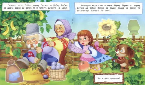 "Репка" — первая сказка, с которой обычно знакомятся малыши. Знакомиться с ней по этой детской книжке будет особенно весело: яркие забавные иллюстрации Виталия Шварова и Елены Алмазовой можно дополнить наклейками, а ещё их нужно как следует рассмотреть, ответить на вопросы и раскрасить картинку в конце книжки. Так чтение первой книжки превращается для малыша в познавательное и развивающее игровое занятие.
