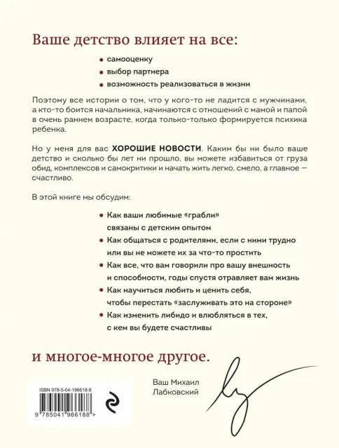 Психолог Михаил Лабковский абсолютно уверен: чтобы изменить сценарий, по которому вы живете, нужно вернуться в детство и понять, почему родители так себя вели. Осознать, что мама и папа были холодны, потому что их самих недолюбили и любить они так и не научились. Агрессивны - из-за своих проблем с психикой. Критиковали, потому что сами в себя не верили, а значит, не верили и в вас. И вы тут ни при чем.