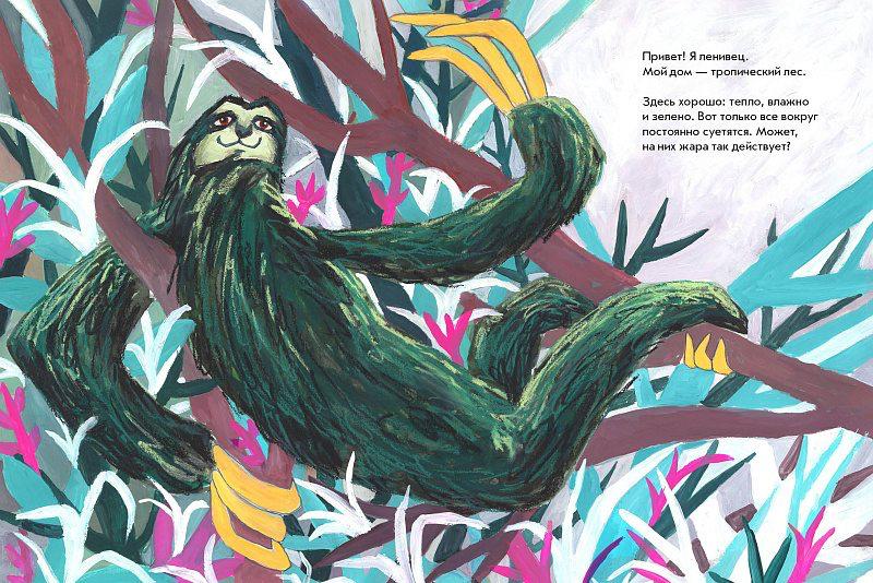 Привет. Я ленивец. Я не ленивый, хотя меня часто называют медленным. Вообще, это правда. Кажется, что все вокруг меня быстрее: колпицы подгоняют, крокодилы зовут посоревноваться, муравьед — поохотиться на муравьёв, а туканы — отбить с ними бит. Но мне это не очень подходит. Я лучше спокойно посижу на дереве, полюбуюсь на небо, и послушаю музыку потише. Это же не значит, что я плохой или какой-то неправильный. Просто я такой.