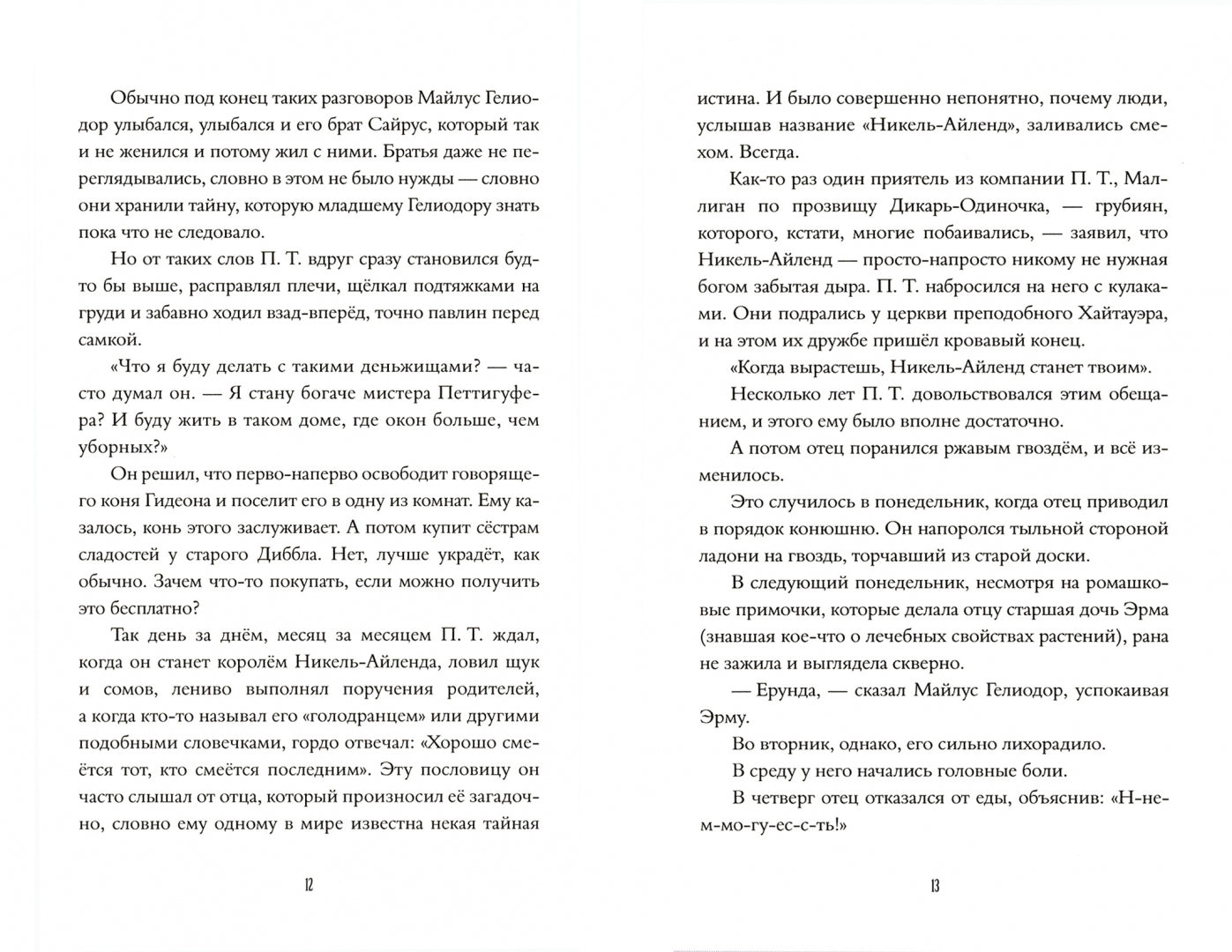 Коннектикут, 1830-е. Тринадцатилетний П. Т. Гелиодор, сын конюха, мечтатель и фантазёр, получает в наследство от отца Никель-Айленд — землю, которую Гелиодор-старший всегда называл королевством, а себя — королём. С детства П. Т. грезил о своих будущих владениях и громком титуле — представлял, как благодаря им он вытянет всю семью из нищеты и горя знать не будет. Но наследника ждёт разочарование: на самом деле Никель-Айленд вовсе не королевство, а клочок земли на болотах, где нашли пристанище все гонимые и отверженные. Чуткий, сердобольный и в то же время предприимчивый П. Т. Гелиодор решает позаботиться о своих подданных и с их помощью осуществить заветную мечту — открыть театр чудес с феерическими иллюзиями.