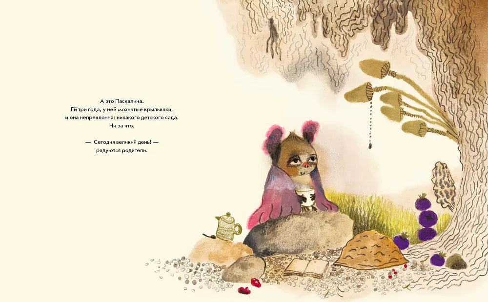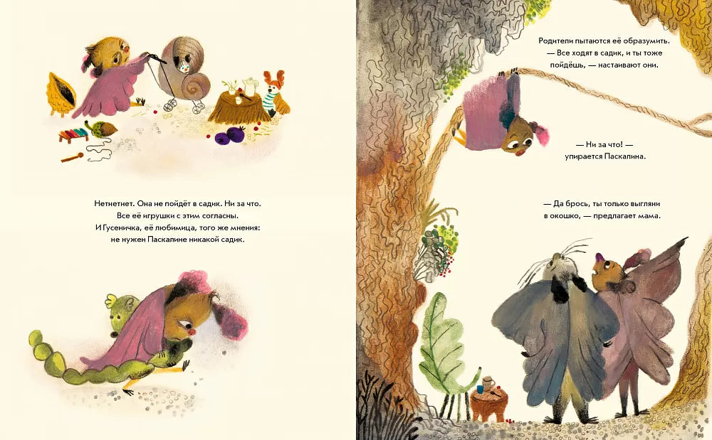 Эта книжка о походе в садик и расставании с родителями хорошо показывает, что может происходить в голове малышей, когда они вынуждены столкнуться с неизвестностью и покинуть родителей. Она одновременно и смешная и нежная, а рисунки Беатриче Алеманьи, без сомнения, прекрасны.