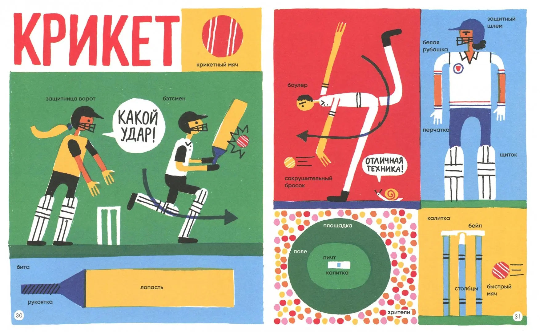 Теннис, парусный спорт, шорт-трек, академическая гребля, прыжки с шестом – в какой бы раздел мы ни заглянули, мы увидим захватывающие моменты матчей и соревнований, необходимые спортивные снаряды и экипировку, разметку игрового поля или дорожки, узнаем основные термины, которыми пользуются спортсмены и судьи. Мы увидим зрелищный пас в американском футболе, узнаем, что такое удар смэш в бадминтоне и дриблинг в баскетболе, полюбуемся на уверенного в себе питчера, стоящего наизготовку кэтчера и меткий удар бэттера в бейсболе, подивимся музыкальным названиям частей костюма фехтовальщика, выучим названия стилей плавания и судовых парусов.